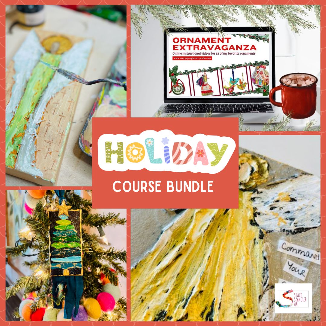 Two of my favorite online mixed media courses perfect for the holidays. Learn to make 12 different ornaments with my Ornament Extravaganza course ($42) and paint beautiful angels with my Amazing Angels course ($19) Save $12 when you purchase this bundle and access beyond the holiday season. Perfect courses for both beginners and seasoned artists.